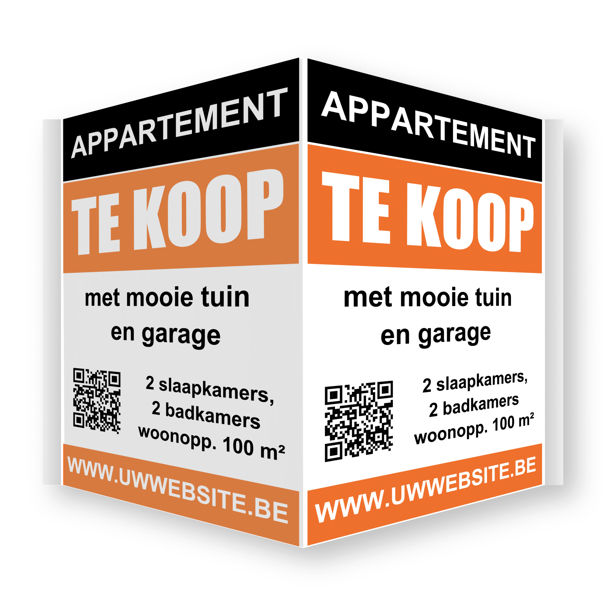 Deze borden worden vooral door immokantoren gebruikt om vastgoed te koop of te huur te zetten. Deze worden meestal op de raam bevestigd maar kunnen evenwel op een andere constructie bevestigd worden. Al onze v-borden worden kant en klaar afgeleverd met zeer sterke kleeftape (3M) en plooilijnen.